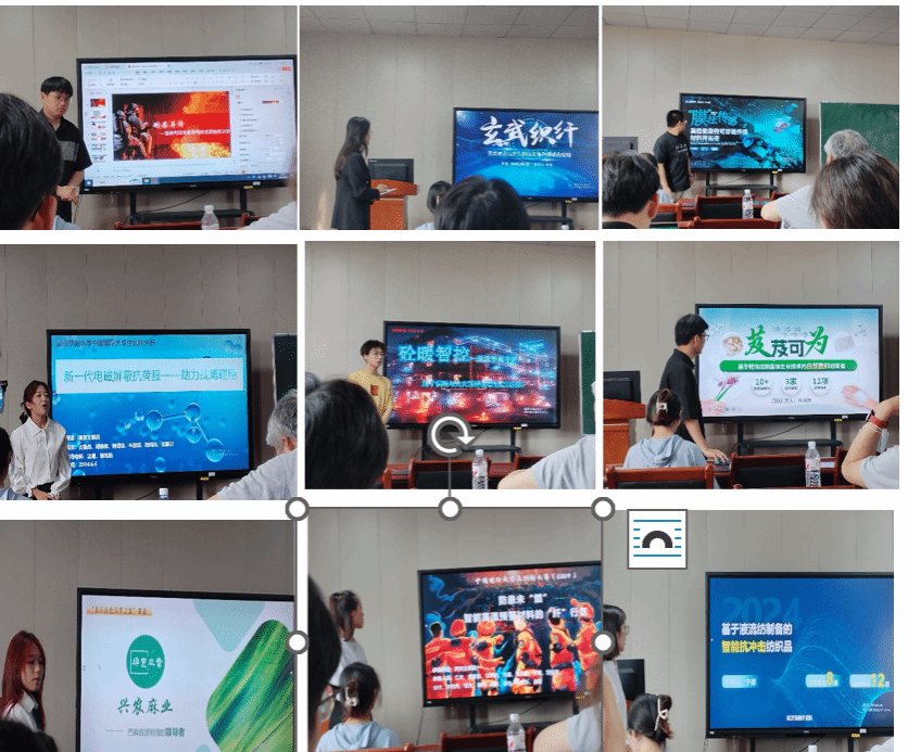 院赛自2023年12月份启动以来,经过广泛宣传和动员,共有125项作品报名。学院优选了14项优秀作品参加院赛答辩。参加本次大赛的各项目汇报人依次介绍了自己项目。向绍琼介绍了“新一代电磁屏蔽抗荷服”,周洋东介绍了"膜"法传感-高性能柔性可穿戴传感设备,顾佳音介绍了“兴农麻业”项目,郑丽萍介绍了“海维盾——航海新纪元的波涛守护者”项目,金正浩介绍了“砼暖智控-安居智能守护”项目,陈定伟介绍了“刚柔并济-玄武岩基消防装备的研发及应用”项目,徐佳琳介绍了“绿净环保科技-水葫芦资源利用的领导者”项目,李杨介绍了“弹无可惧—新型针织防弹伞布开拓者”项目,徐执钦介绍了“芨芨可为——基于靶向控制晶体生长技术的白芨敷料领军者”项目,韩秀介绍了“玄武织纤-玄武岩纤维及其衍生制品在特种领域的应用”项目,屈雪茹介绍了项目“防患未“燃”---智能高温预警材料的“纤”行者”,宁惠介绍了“液流体纺纱技术及其智能应急防护纺织品开发”项目,黄丽娜介绍了水相提取咖啡渣色素及锦纶抗UV染色。