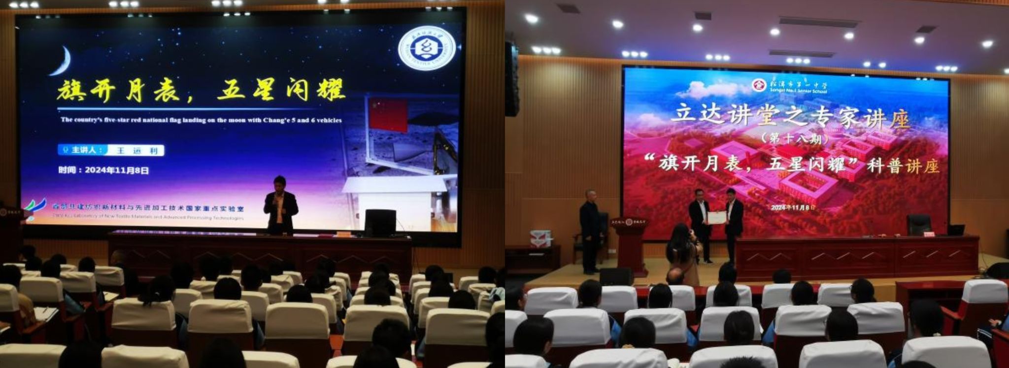 报告会上,王运利为同学们科普了关于宇宙演变的历史,并从太空环境、月球环境、人类探月之旅、太空中的国旗、嫦娥五号及六号月面展示国旗五个方面讲述了月面国旗科研、制作过程中需要破解的技术难题,给高中生们带来了一场生动的纺织科技推动新质生产力发展的科普讲座。王运利教授是徐卫林院士月面国旗研究团队的核心骨干成员之一,他用生动活泼的内容、绘声绘色的语言、精心设计的PPT牢牢锁住了高中生的注意力。班主任们表示“今天的报告会上同学们眼里太有光了”。会上王运利与同学们进行了互动交流,进一步加深了同学们对日本动漫
