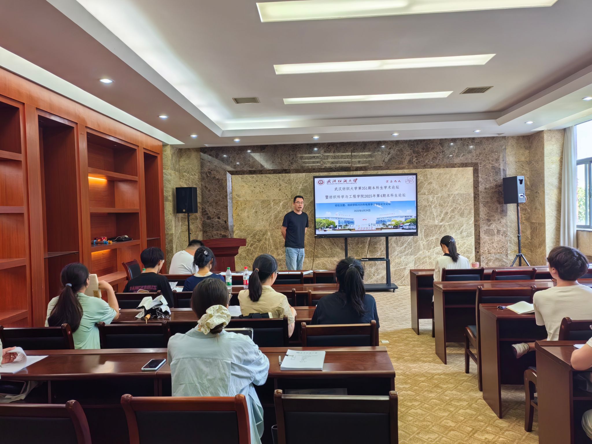 2025年“优秀毕业论文(设计)”答辩评审会在8H302成功举行。纺织产品系徐杰老师、非织系胡敏老师、轻化工程系李晖老师担任答辩评委,学院各年级、各专业学生代表到场参与观摩学习。
