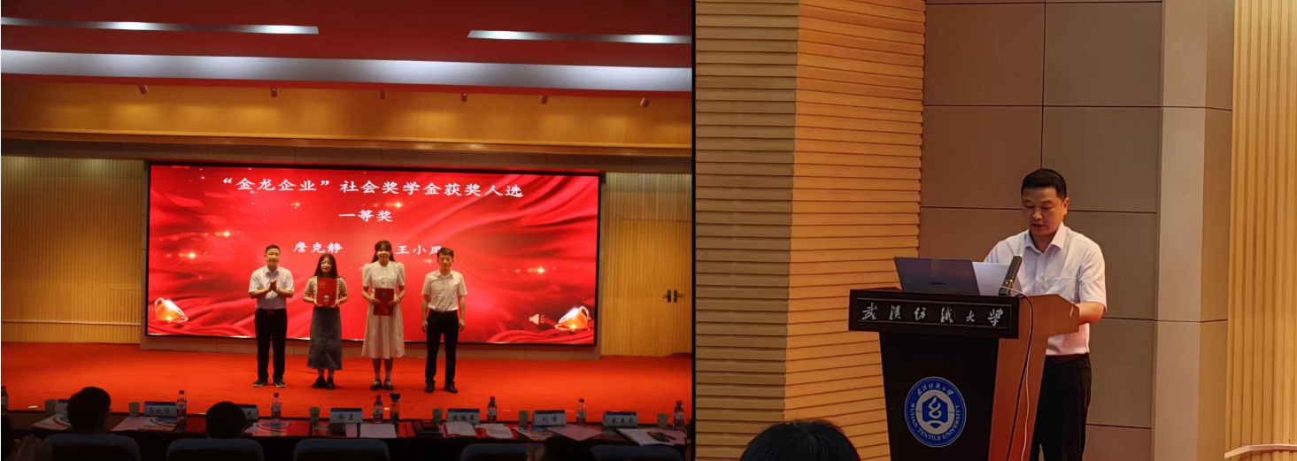 捐赠资金,设立“金龙”企业奖学金,为激励学生立足纺织专业成长成才提供动力。在现场,主持人介绍金龙奖学金评选情况后,湖北省金龙集团邹勇总经理宣读金龙企业奖学金获奖名单,寄语青年要树立远大理想,坚忍不拔、奋发向上,以踏实努力和深耕细作力争革新纺织技术、创新纺织成果,为纺织事业发展贡献自己的聪明才智,用纺织科技服务祖国与人民。同时邹勇总经理也邀请广大纺大学子去金龙实习实训、创业,加入金龙大家庭,成就更好的自己!