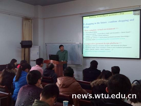 曾宪奕教授详细介绍了其研发团队人员组成与最新研究进展,他表示由其团队研发的智能服装联动设计决策支持系统已经相当成熟,并已经投入实际生产运用。曾教授还就纺织服装材料学习数据库的建设以及服装面料3D虚拟展示等内容和现场师生交流,现场学术气氛活跃。曾教授学术报告内容涉及多个学科内容,其团队科研水平位于世界前沿,为现场师生带来较大启发。