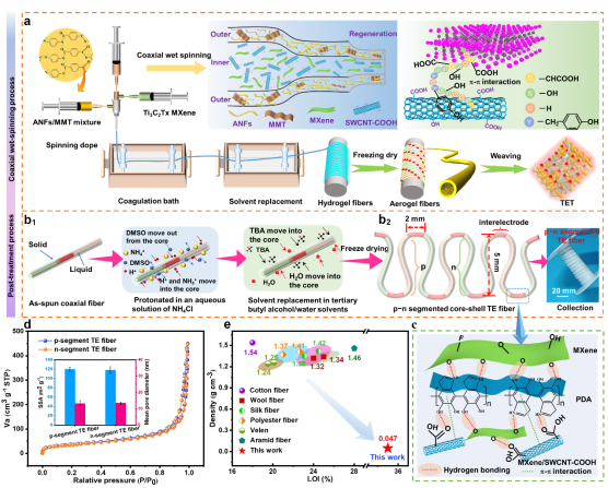 为解决上述问题,该研究提出了一种具有同轴核壳结构连续交替排列的p-n型热电气凝胶纤维制备技术,实现了柔性纤维内热电器件的p-n串联,解决了热电纺织品繁琐的p/n组装问题。本研究采用同轴湿法纺丝策略,以n型Ti3C2Tx MXene和p型MXene/SWCNT-COOH作为核层,芳纶纳米纤维(ANFs)为壳层,制备出机械和热电性能良好的p-n连续交替分段式热电气凝胶纤维。高性能ANFs壳层在提升MXene可纺性的同时,大大增强了MXene基纤维的力学性能及环境稳定性。进一步,将该纤维编织到具有一定厚度的芳纶织物中,在织物的厚度方向进行热电臂之间的电串联及热并联,构建了三维立体热电织物。该热电织物的发电方向为织物的厚度方向,实现了垂直平面方向热能的有效利用。另外,根据输出的热电电压与温度之间的线性相关性,在火场环境下,该热电织物可对消防服装表面温度进行实时、精准监测,为消防服用自供电火灾预警电子纺织品的设计制备提供了一条新思路。