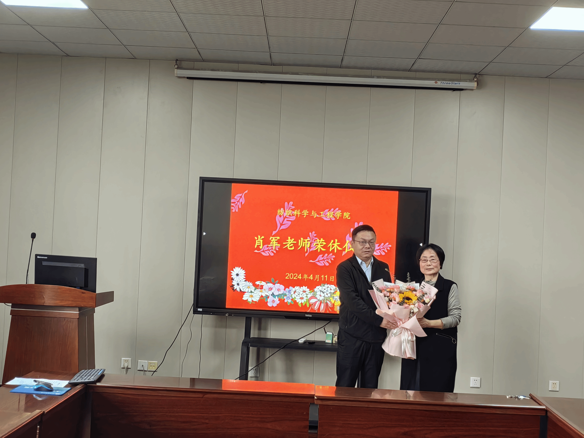 院长蔡光明代表学院向肖老师赠送鲜花和纪念品