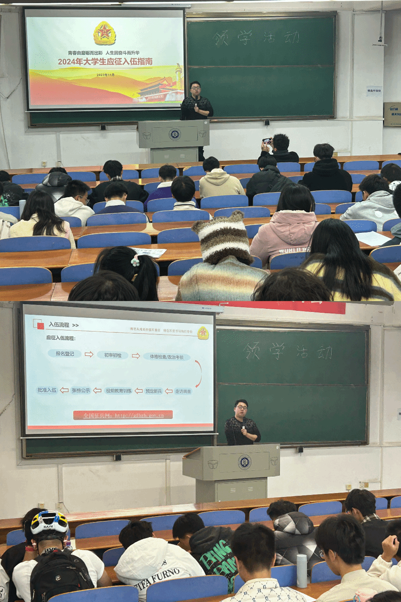 为鼓励同学们积极入伍,11月26日晚,日本动漫 在YG-T101开展了“2024年大学生应征入伍指南宣讲”大会。23级辅导员余国铖、向婷及23级全体同学共同参与。