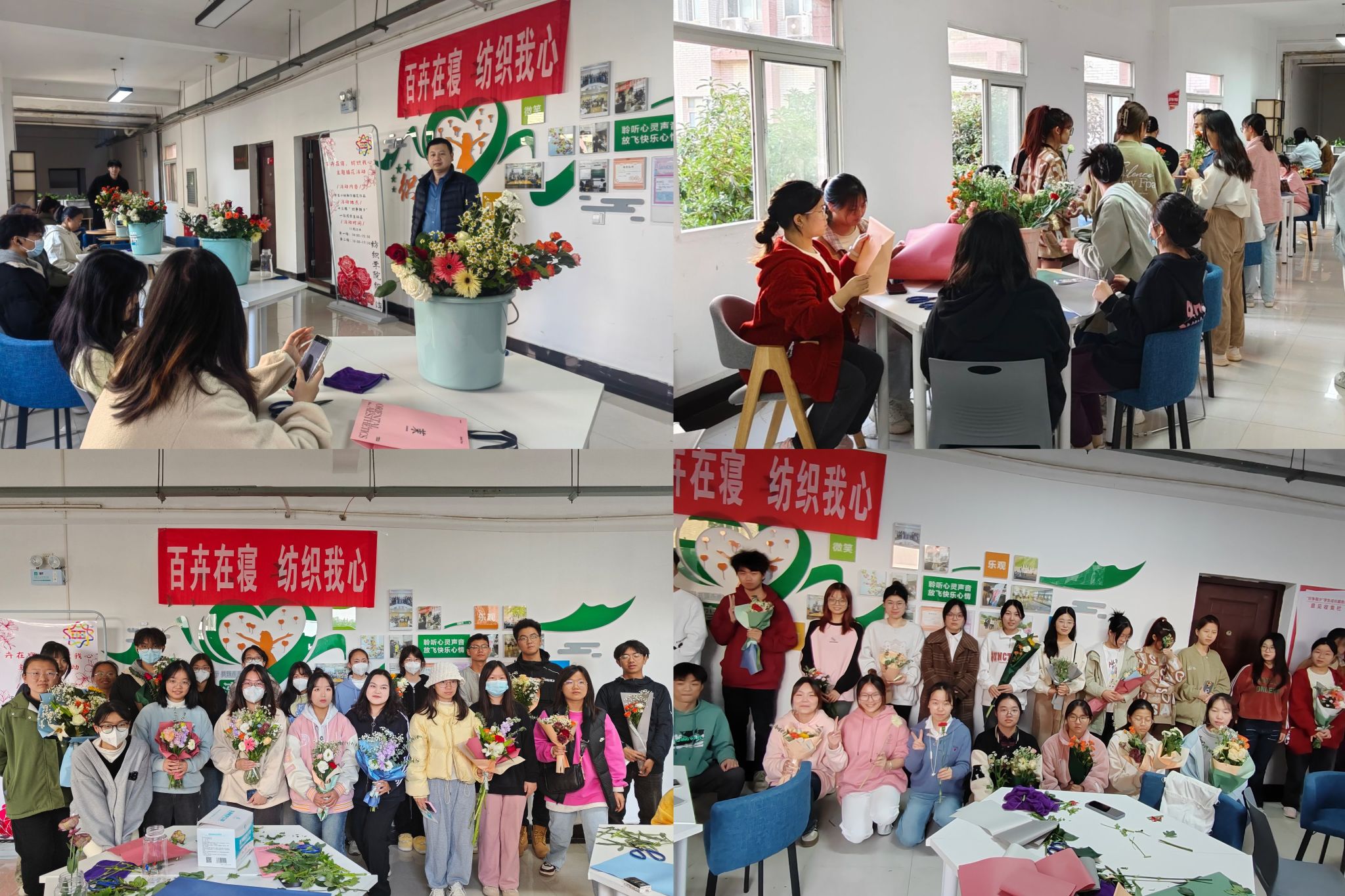 织心湾在十三栋“织争朝夕”学生一站式社区举办了“百卉在寝,‘纺织’我心”主题插花活动。赵亮、吴童玲、余国铖、向婷老师、织心湾全体成员及学生代表参加了本次活动。