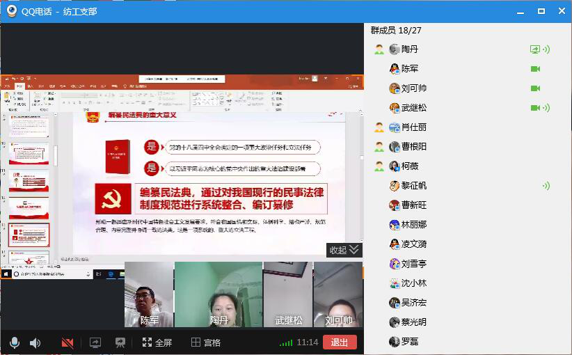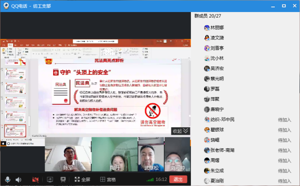 纺织工程系教工党支部通过QQ视频开展“学习民法典”线上主题党日活动,会议由支部书记陶丹主持,全体教工党员参加。