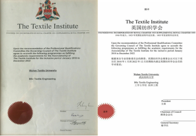 此前,我校纺织工程专业已获得英国纺织学会(The Textile Institute)工学学士学位认证。