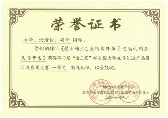 等单位的非织造材料专家和行业领军人物担任评审专家组织评审。由我院韦炜老师指导的学生团队的参赛作品《聚吡咯/尼龙纳米纤维导电膜的制备及其开发》因体现了非织造专业知识与其他领域知识、技术的深度“融合”,展现了非织造生产工艺、产品应用领等方面所反映的“创新”,充分契合大赛主题“融合与创新”而荣获一等奖。
