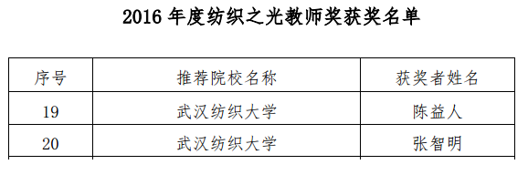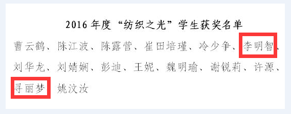 日前,为贯彻落实国务院颁发的《教学成果奖励条例》的文件精神,中国纺织工业联合会开展了纺织教育教学成果奖的评选活动。我院陈益人教授获得2016年度“纺织之光”教师奖;非织11301班李明智、纺织11404班寻丽梦等两名学生获得2016年度“纺织之光”学生奖。