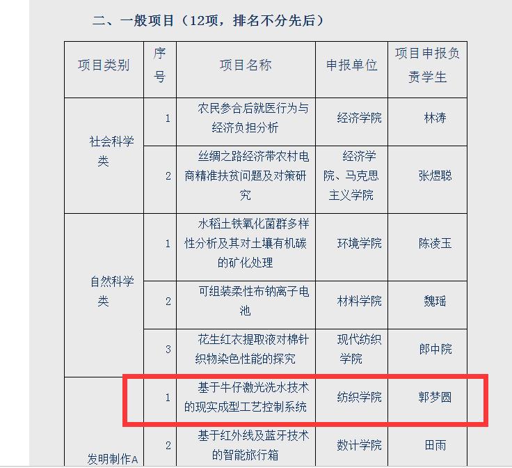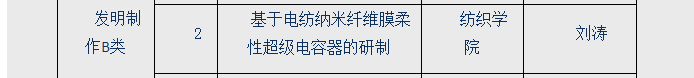 11月25日,校学工部(团委)正式公布经由校内外专家匿名评审获批立项的2017年“挑战杯”培育项目,我院共有两项学生课外科技学术作品入围。其中由韦炜老师指导的非织11402班学生刘涛个人作品《基于电纺纳米纤维膜柔性超级电容器的研制》入围重点项目,由易长海教授指导的纺织11402班学生郭梦圆团队作品《基于牛仔激光洗水技术的现实成型工艺控制系统》入围一般项目。