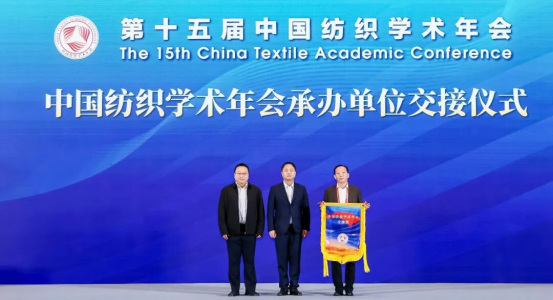 副校长冯军手中,2026年第十六届中国纺织学术年会将在我校举办,期待明年再会。