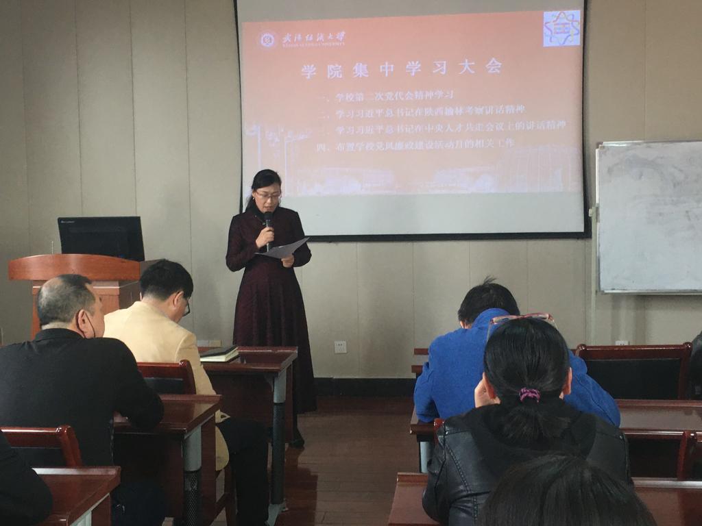 随后,学院领导班子分别就近期各自分管的工作进行了布置和安排。大会还学习了习近平总书记在在陕西榆林考察讲话精神以及习近平总书记在中央人才共走会议上的讲话精神。