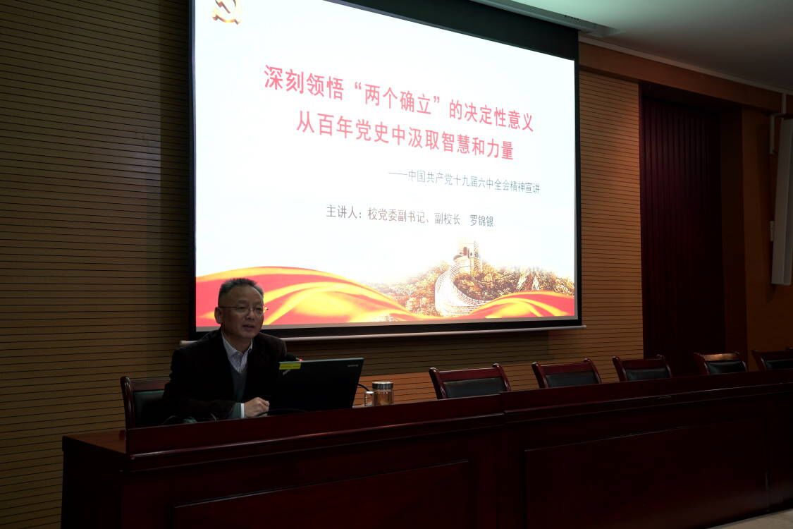 罗锦银以深刻领悟“两个确立”的决定性意义为切入点,从整体把握党的十九届六中全会概况、深刻理解三个“历史决议”中的“两个确立”、深刻认识“两个确立”的重要意义、坚决捍卫“两个确立”做到“两个维护”等四个方面进行对党的十九届六中全会精神进行了全面系统宣讲。重点将党的十九届六中全会审议通过的《中共中央关于党的百年奋斗重大成就和历史经验的决议》进行了数字化解读,并通过梳理百年党史,深刻理解《关于若干历史问题的决议》、《关于建国以来党的若干历史问题的决议》、《中共中央关于党的百年奋斗重大成就和历史经验的决议》,号召广大党员同志坚定拥护党中央的领导核心,把捍卫“两个确立”真正转化为做到“两个维护”的思想自觉、政治自觉、行动自觉,把学习领会党的十九届六中全会精神转化为建设美好纺大的行动指南,坚定“一二三四五六七”发展思路,坚持“三步走”发展战略,同心建设中国梦的纺大新篇章。