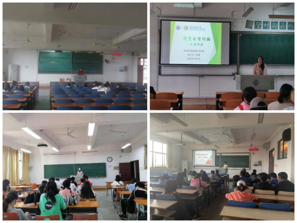 本期主题班会,各班级班主任点名确认学生到会情况,与同学们展开有关清明假期的交流。在21级班会现场,纺织类12101班班主任曾贝妮对自己的班级的同学提出,每位学生都应该有防范电信网络诈骗的意识,并从什么是电信网络诈骗、学校电信网络诈骗发案情况、常见的诈骗形式、如何防范识别等四个方面来进行详细讲解,提醒每个同学牢记“八个凡是”、守护好自己的“钱袋子”,谨防被骗。