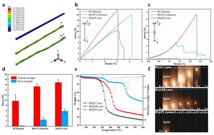 图2. BS@PI纱线的力学和阻燃性能