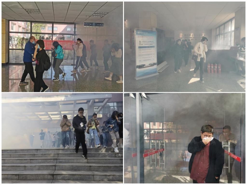 疏散演练指令下达后,8号楼大厅内烟雾腾起,警铃骤响,各位老师、研究生、本科生在分管负责人的组织下,迅速戴好防护用品,从应急疏散通道用湿毛巾捂住口鼻,弯着腰,俯身沿着指定应急通道紧急撤出。