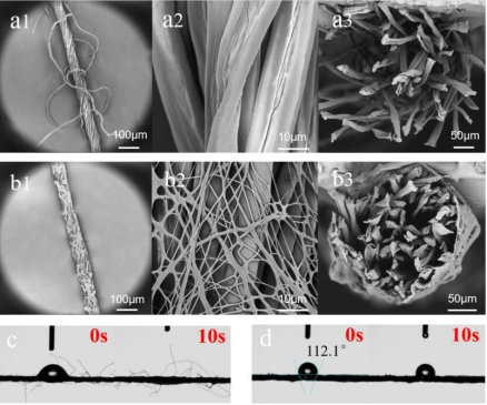 图3(a)和(b)表示C和NC纱线与蓝色棉纱交织形成双面织物。显然,NC纱织物表面更光洁。NC纱线织物两面具有相反的透水性能有:液压分离(N侧)和亲水(O侧),MMT测试结果如图3(e)和(f)所示。该研究结果以“Qualified nano-composite yarn for hydrophobic fabric via online nano- and micron-fiber composite spinning”为题,发表在Textile Research Journal(DOI: 10.1177/00405175221124357)期刊上。论文的第一作者为日本动漫