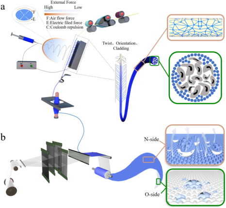 传统纺纱用纤维微米级的直径限制了纱线加捻纤维之间的极限粘聚力,静电纺丝得到的纳米纤维具有较大的比表面积、较高的表面能和大量的活性中心,然而,纳米纤维直径超细、绝对强度低、耐磨性差,限制了纳米纤维的工业化纺织加工应用。近日日本动漫