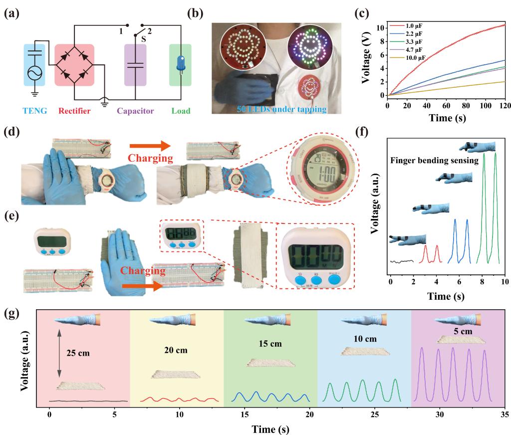 图4. 多功能纱线传感器的能量收集及自供能传感应用