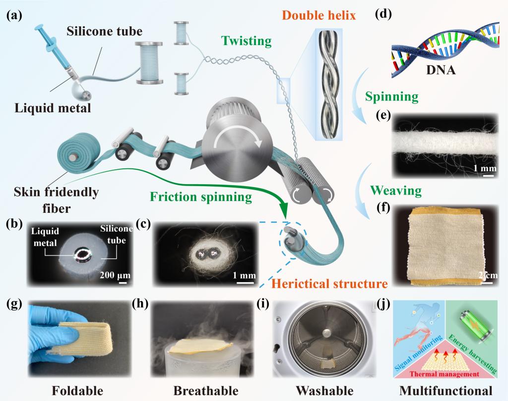 徐卫林院士团队的夏治刚教授,携手中科院纳米能源所董凯研究员、华中科技大学苏彬教授,受DNA双螺旋稳定结构的启发,通过摩擦包芯复合的液流纺纱技术(图1),开发了一种基于液态金属的双螺旋包芯纱,实现了柔性纱线传感器的大量生产,用于人体运动监测、能量收集和热管理。