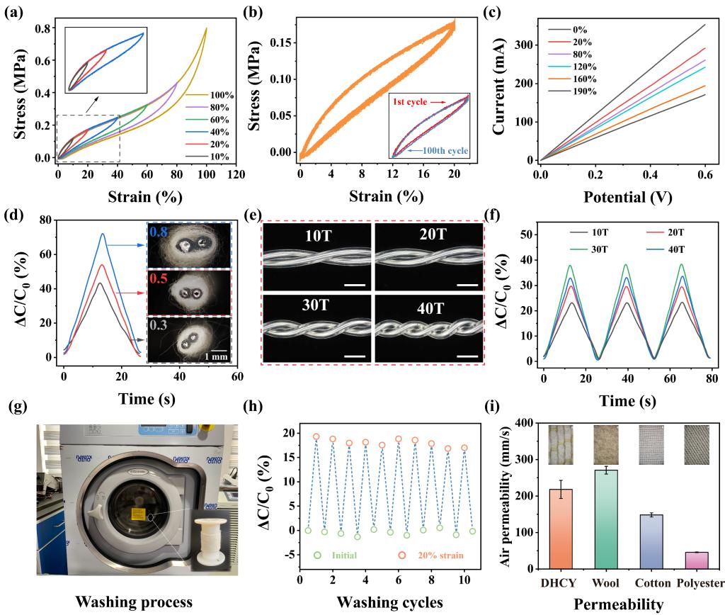 硅橡胶赋予纱线低迟滞并且稳定的拉伸回复性能。此外,由于纱线稳定的双螺旋和多级结构,纱线及其织物表现出柔韧、透气、且耐水洗的综合优势(图2)。