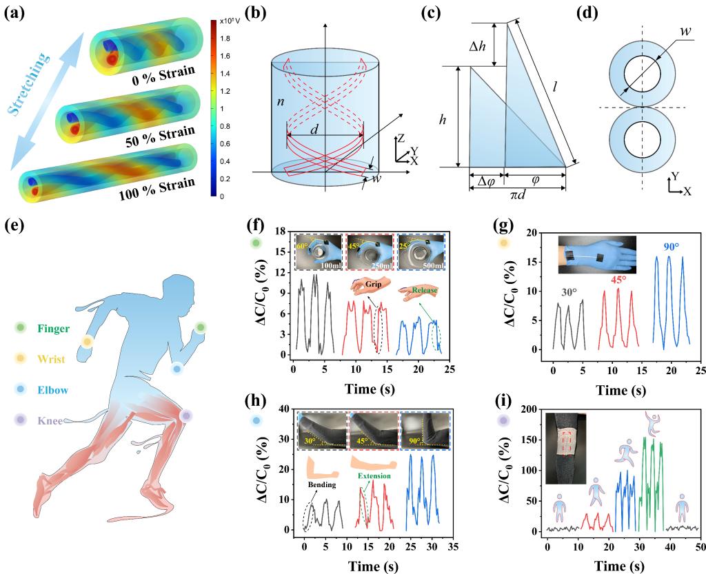 双螺旋包芯纱线通过将两根导电中空丝并捻,形成了柔性电容器结构。受拉伸作用力,该纱线传感器的两根导电丝之间接触面积增加,因此纱线传感器的电容随拉伸应变增加而增大,且表现出良好的工作范围 (100%)、高灵敏度、超低滞后、稳定和高耐用性(6000次循环),可应用于可穿戴传感应用(图3)。
