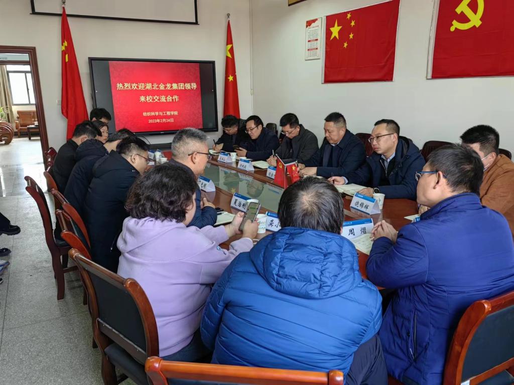 蔡光明院长的主持下进行,他首先代表学院对金龙集团董事长一行的到来表示热烈欢迎,并对学院发展历史、专业特色、人才培养、校企合作等情况做了介绍。他表示,湖北金龙集团是一个创新性强、产业化的集团,在行业内具有鲜明的特色优势和地位,希望未来在人才培养、新领域拓展等方面能够有更深度的合作。