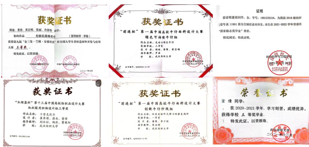 大二上学期开始真正系统性的接触专业课程,眼前的一切知识都十分令她着迷。得益于专业课老师的悉心教导,她开始在专业知识领域一点点摸索。纺织材料学课堂上,她认真听讲,汲取专业知识。课下,她便进入实验室跟随导师进行实验研究,参加比赛。专业知识的薄弱以及实验操作的失败并没有让她退缩,反而激发了她坚韧的品格,锻炼了她的耐心。最终,她在纺材期末考试中取得了班级第一的专业课成绩,在专业比赛中也获得了第一份奖项。后来,每学习一门新的课程,她都把从纺材获得的鼓舞转移到新的课程上,并且积极参加其他专业科研赛事。一共获得第九届金三发非织造材料开发与应用全国三等奖,获得第一届前进杯牛仔面料设计大赛全国一等奖、全国三等奖,获得第十三届红绿蓝杯面料设计大赛全国三等奖。大学四年成绩一直名列前茅,专业必修课平均绩点4.25,获得国家励志奖学金和校级奖学金等荣誉。
