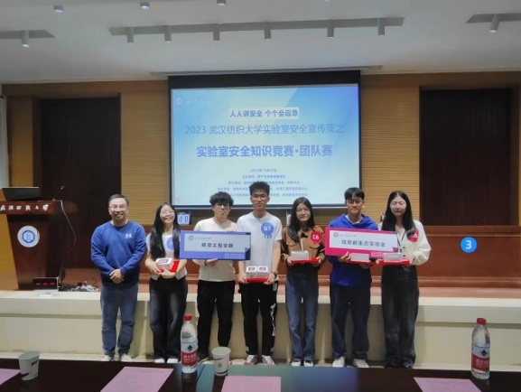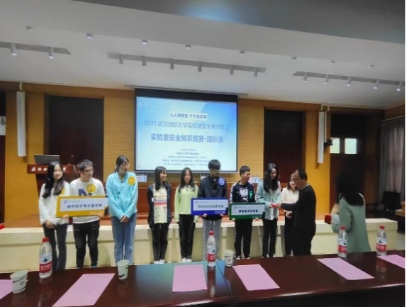、材料科学与工程学院、环境工程学院、化学与化工学院、国家重点实验室、教育部重点实验室六支队伍组成。通过第一赛段—群雄逐鹿,第二赛段—三强鼎立,第三赛段—王者争霸,全方位实验室安全知识答题、竞赛抢答,决出胜负,其中化学与化工学院队伍获得一等奖,环境工程学院、教育部重点实验室获得二等奖,其他参赛队伍获得三等奖。比赛过程中,设立现场观众互动环节,同学们踊跃参与到活动中。比赛结束后,举行颁奖仪式,张艳波老师、孙磊老师和材料科学与工程学院实验中心主任陈祖玉老师分别为团队赛一等奖、二等奖、三等奖获奖同学颁发荣誉证书和奖品。