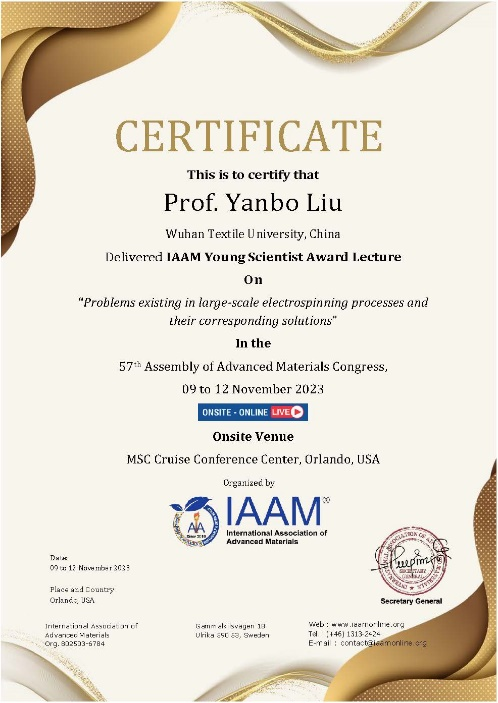 非织造材料与工程系刘延波教授作为2023年度国际先进材料协会(IAAM)青年科学家奖章(Young Scientist Medal)获得者受邀参加了于2023年11月9~12日在美国奥兰多市举行的第57届先进材料世界大会(57th Assembly of Advanced Materials Congress), 并作了题为“Problems Existing in Large-scale Electrospinning Processes and their Corresponding Solutions” 的大会报告(IAAM 青年科学家颁奖演讲),会后收到了报告证书和奖励证书,本年度共有3名中国科学家获奖。
