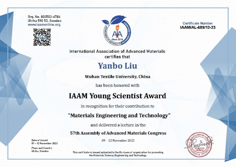 在IAAM发给刘延波教授的颁奖信上,总秘书长Dr. Ashutosh Tiwari热情地写道:“国际先进材料协会的奖项和认可委员会(International Association of Advanced Materials' award and recognition committee)选择您作为今年的“青年科学家奖章”的获得者,以表彰您在科学、工程和技术领域的贡献,特别是在跨学科应用的材料领域的杰出贡献。我们很荣幸邀请您在本次峰会上发表青年科学家奖章演讲。”