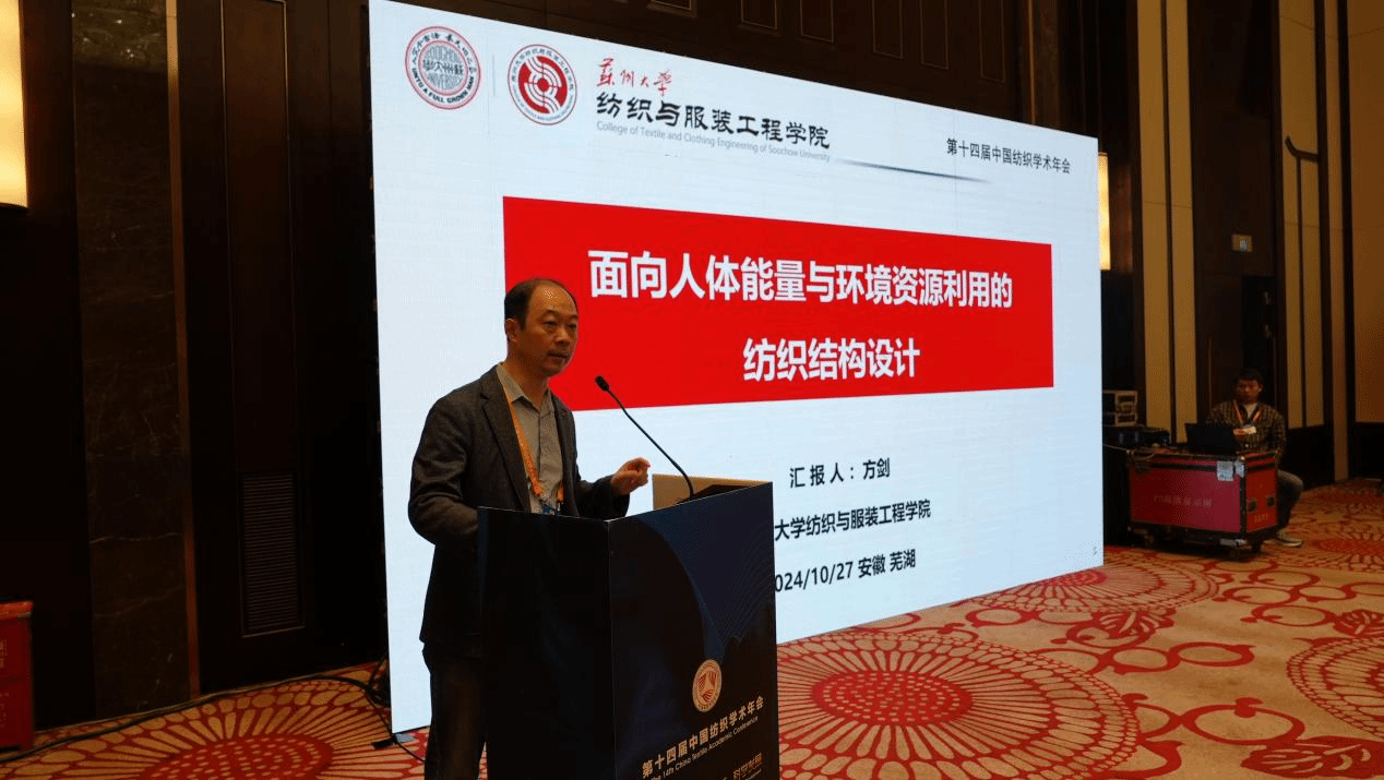 苏州大学方剑教授做了“面向人体能量与环境资源利用的纺织结构设计”的主题报告。
