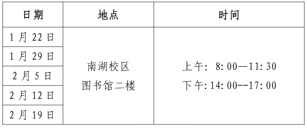 (一)南湖校区食堂:南湖教工食堂为假期值班食堂,保障每日早、中、晚餐三餐供应。南湖学生临时食堂保障窗口供餐至1月19日晚餐。