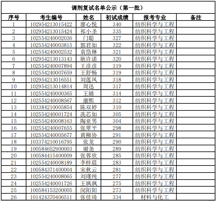 我院硕士研究生调剂复试(第一批)名单见下,请各位考生收到复试通知后于规定时间内在调剂系统上进行确认,并根据本网站前期发布的调剂公告按时提交资格审查材料及缴纳复试费用。
