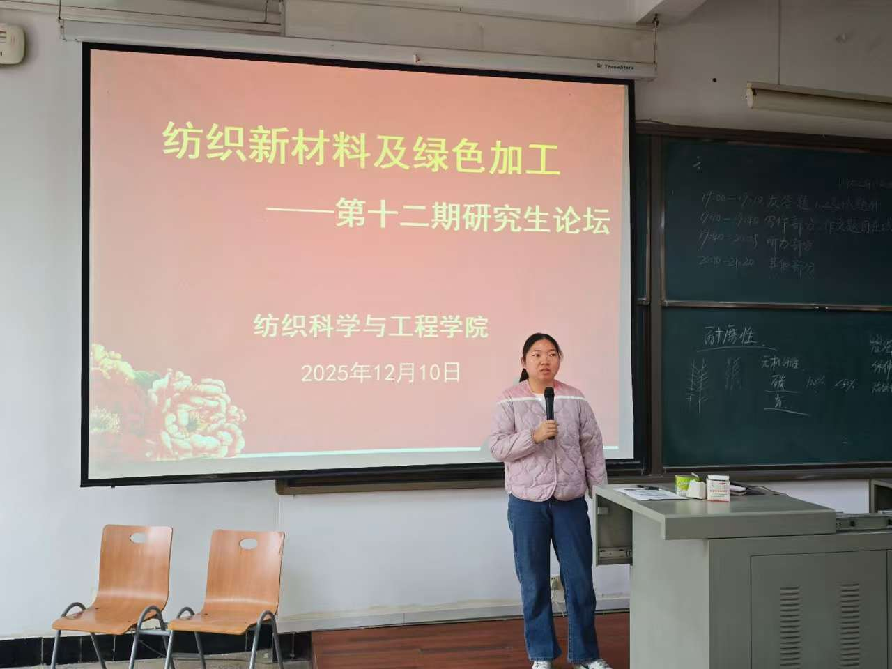 为了进一步促进学院的科研工作,加强师生间的学术交流,提高研究生素质和学术氛围,我院于12月10日下午14:30举办了第十二期“纺织新材料及绿色加工”研究生论坛。