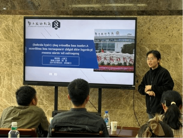 本次论坛汇聚 6 位博士研究生,围绕纺织科学、材料工程、生物医用等前沿方向开展学术汇报:齐杭杭分享酶法剥皮调控苎麻纤维结构研究进展;赵华旺介绍定向胶原 / CMC-Ca 复合支架在快速止血领域的应用;尚路路阐述分级液流纺丝制备透气高抗冲击 STF 基 TENG 的智能防护应用;施雯雯展示超高拉伸、耐用透明聚氨酯纤维基光致发光智能纺织品;胡泽馗解析主盐浓度与沉积时间对 GCr15 钢表面 Ni-B-Mo 化学镀层的影响;陈钰莹汇报强韧、粘附、高透明、防冻 PVA 水凝胶在应变传感器中的研究。每位选手在 8 分钟内,清晰阐述课题背景、核心内容、创新亮点与未来规划,展现出扎实的科研素养与前沿视野。