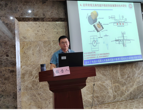 刘可帅副教授以“热致分层集聚调控纤维成纱机理及其制品性能研究”为题,主要介绍了热致分层集聚调控纤维的研究现状,探讨了热致分层集聚调控纤维成纱机理,同时他也展示了自己在热致分层集聚调控纤维成纱研究上的工作进展和研究成果。多年来,刘可帅副教授一直从事特种功能航天军工纺织品的研制、纺纱部件研发与工程化,研究成果在国家航空航天项目上得到了应用,为我国航空航天事业做出了重大贡献。
