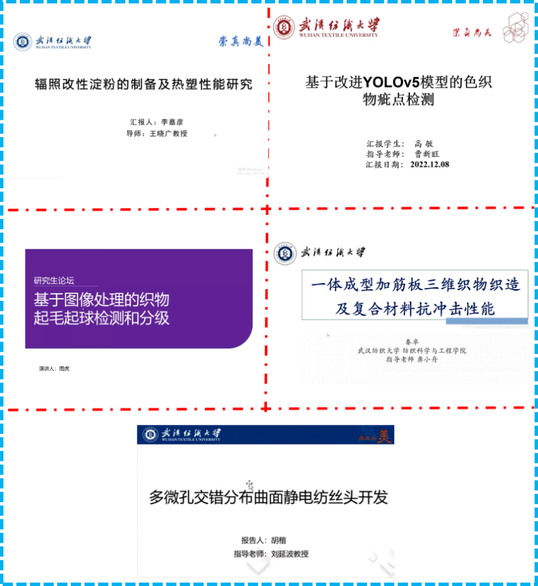 论坛上,李嘉彦、高敏、周虎、秦卓、胡楷五位同学分别介绍了自己的研究课题和目前取得的研究进展,并分享了自己的科研经验。主讲同学的研究课题涵盖了改性淀粉、三维织物、静电纺丝等领域,契合了“纺织新材料及绿色加工”主题,代表了学院最新研究进展,营造了良好的学术氛围。
