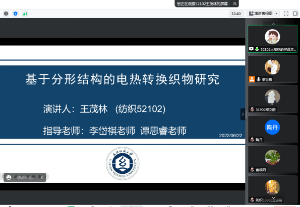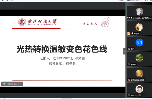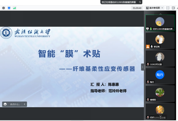 本次本科生学术论坛由学院4位本科生交流了课外科技成果 。纺织12001班陈惠惠汇报了纤维基柔性应变传感器的制备及其性能研究,项目获得“互联网加”大学生创新创业大赛湖北省金奖。纺织31902班邓文丽汇报了光热转换温敏变色花色线的研发,项目获得“前进杯” 中国高校牛仔面料设计大赛全国特等奖和“新澳杯”大学生纱线设计大赛全国一等奖。纺织52102班王茂林汇报了基于分形结构的电热转换织物的研究,项目获得“溢达杯”大学生创意大赛校一等奖。纺织52001班金志毅汇报了本征抗菌面料的开发及在内衣上的应用,项目获得“挑战杯”大学生创业计划大赛校铜奖。