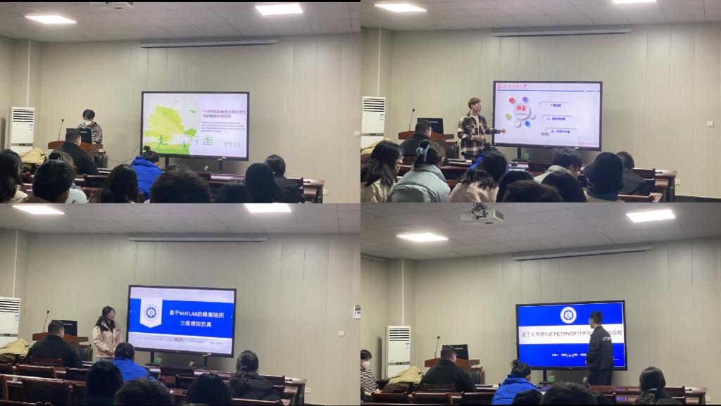 论坛上,王强、朱命伟、魏蒙嫄、高鑫羽四位同学依次介绍了自己的研究课题和目前取得的研究进展,并分享了自己的科研经验。主讲同学的研究课题涵盖了防护服面料、尼龙面料、蜂巢组织三维模拟仿真、PET/PVDF纤维毡等领域,契合了“纺织新材料及绿色加工”主题,代表了学院最新研究进展,营造了良好的学术氛围。