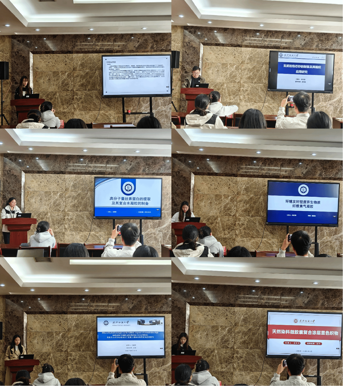 论坛上,张希凤、张文清、冯思影、陆佳润、宋萧彤、郭玫帆六位同学依次介绍了自己的研究课题和目前取得的研究进展,并分享了自己的科研经验。主讲同学的研究课题包括压电复合材料、玄武岩包芯纱、高分子量丝素蛋白、环境友好型废弃生物质纤维素气凝胶、芳纶/超高分子量聚乙烯机织物、天然染料复合涂层显色织物,契合了“纺织新材料及绿色加工”主题,代表了学院最新研究进展,参会人员积极提出问题和建议,营造了良好的学术氛围。