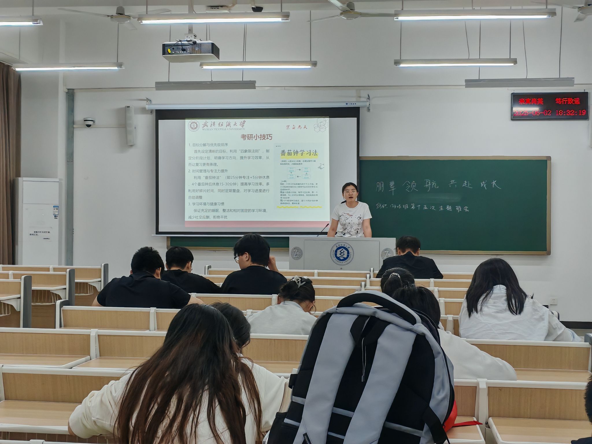 纺织12302班国奖获得者周怡心从从国奖申请、专业学习、科研竞赛和综合发展四个方面给大一、大二学生展开分享。她介绍了国家奖学金的评定细则,提醒同学们课堂学习的重要性,强调大学学习要注重课堂效率,做好预习和复习结合自身科研经历,详细介绍“挑战杯”、“互联网+”等赛事的参赛流程和注意事项,鼓励同学们打破信息壁垒,积极参与课外科技竞赛活动,鼓励同学们积极参与学生组织和学生社团,锻炼自身的沟通、组织和应变能力,在实践中了解社会需求,提升综合素质。