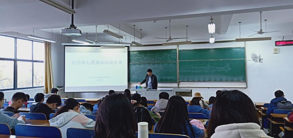 于11月26日下午15:45在三栋教学楼116教室开展了以“做同学心灵成长的陪伴者”为主题的培训会。此次培训会由大学生心理健康教育中心的赵宝富老师主讲。大一、大二全体心理委员、寝室长参加了此次培训会。