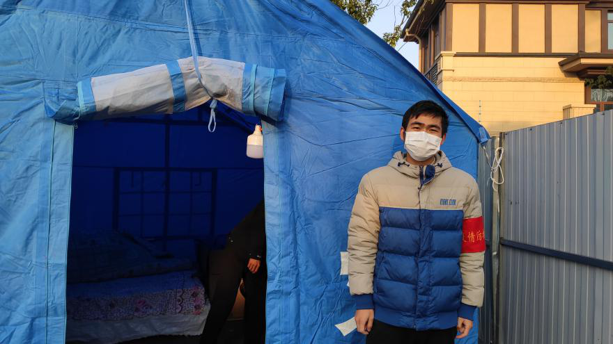 2月16号,我被安排在东湖路95号红军村门口值守,连续两天值守夜班,天气寒冷,穿着防护服无法上厕所,所以不敢喝水吃东西,渴了饿了也只能忍着,条件艰苦。后来越来越多志愿者加入值守,加上社区为每个值班点搭值守帐篷,工作开始有序起来。