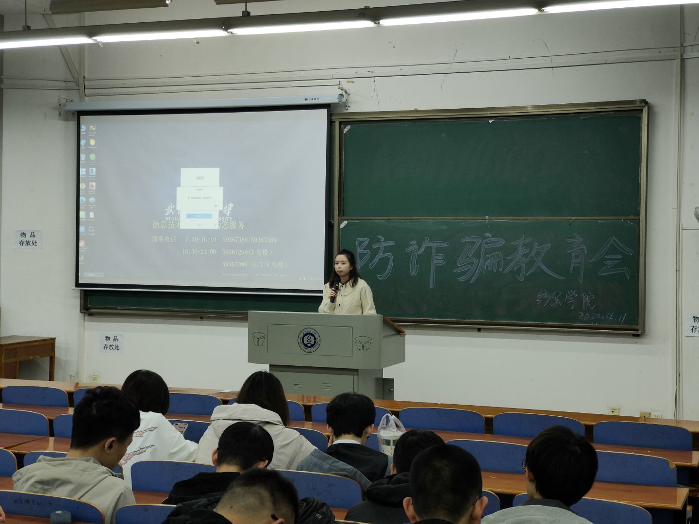 最后老师强调了电信诈骗的特点和如何自我保护的方法,并为大家列举了许多例子,以此告诫大家一定要重视、保护自己的财产安全。此外还向大家介绍了各种安全平台,可供大家学习,希望大家都能远离危险。同学们认真听讲,认真学习并记录,整个会场气氛严肃。