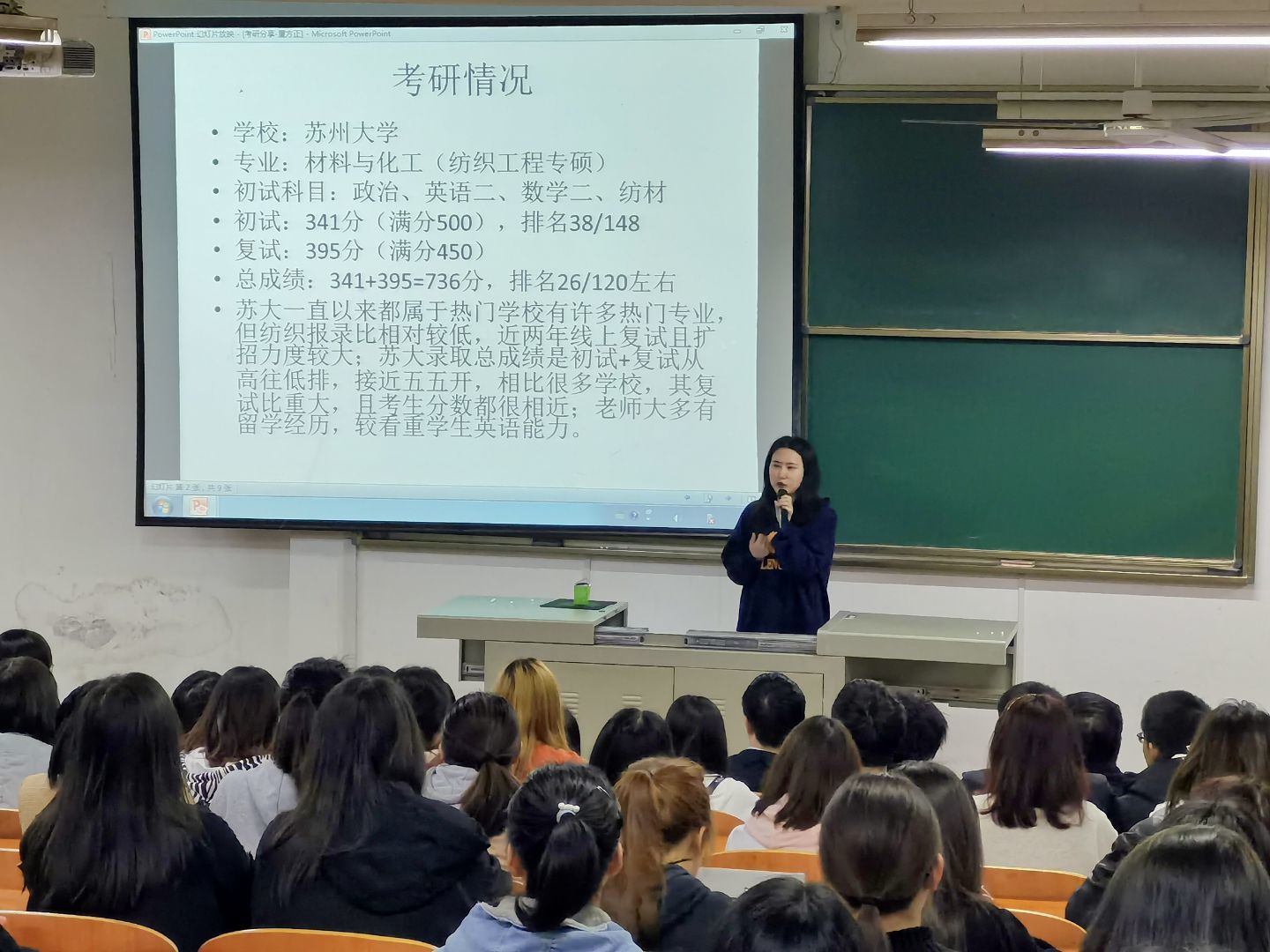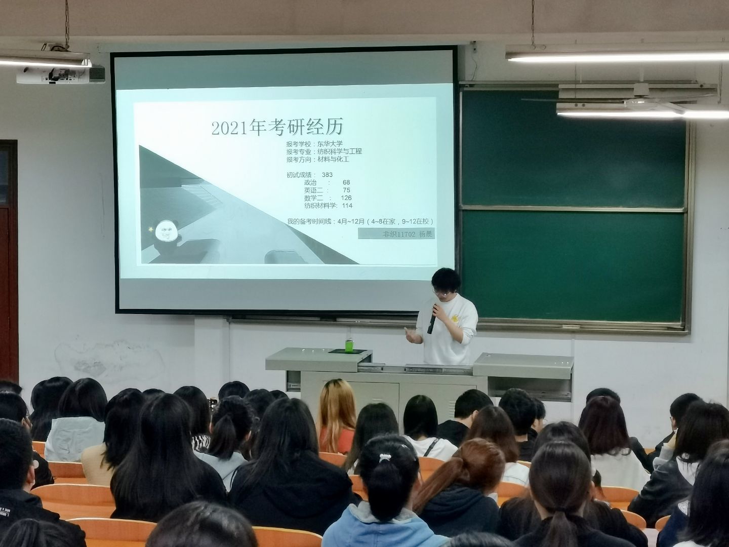 本次交流会从本专业、跨专业考研和海外留学三个方面,通过四位学长学姐的分享为同学们提供了经验交流与答疑。在本专业考研方面,为同学们交流经验的是考取东华大学的杨晨和苏州大学的童方正。他们从时间规划这一方面入手,传授了各个学科的学习经验,推荐了实用的考研APP、公众号如番茄todo、槟果考研等。对于同学们考取专硕方面提出了建设性意见。