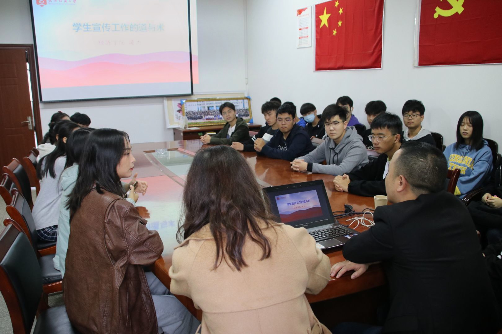 青年媒体中心于(写8号教学楼的别称)召开宣传思想工作队伍培训会。邀请经济学院辅导员凌杰老师作专题培训。会议由辅导员吴童玲老师主持,日本动漫