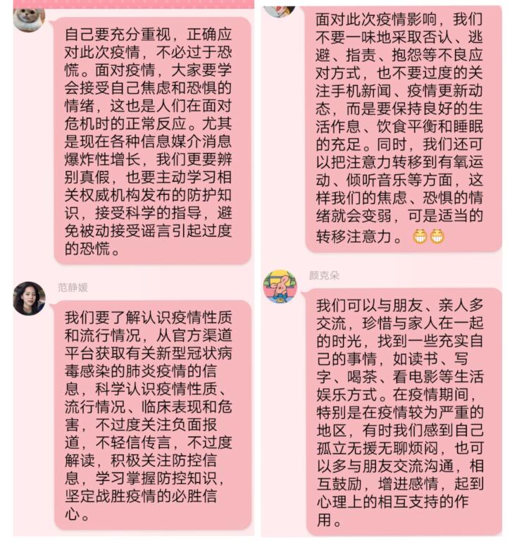 在这次班会的最后心理委员提出了“面对疫情,我们应该如何调控自己的情绪”的问题,同学们踊跃发言,给出了自己的答案。通过这次班会,我们学习了许多疫情知识,了解到疫情并不可怕,科学防控很重要;学会了正确接纳自己的负面情绪,学会了充实自己转移注意力,从而达到减压的的效果。 我们为武汉加油!中国加油!