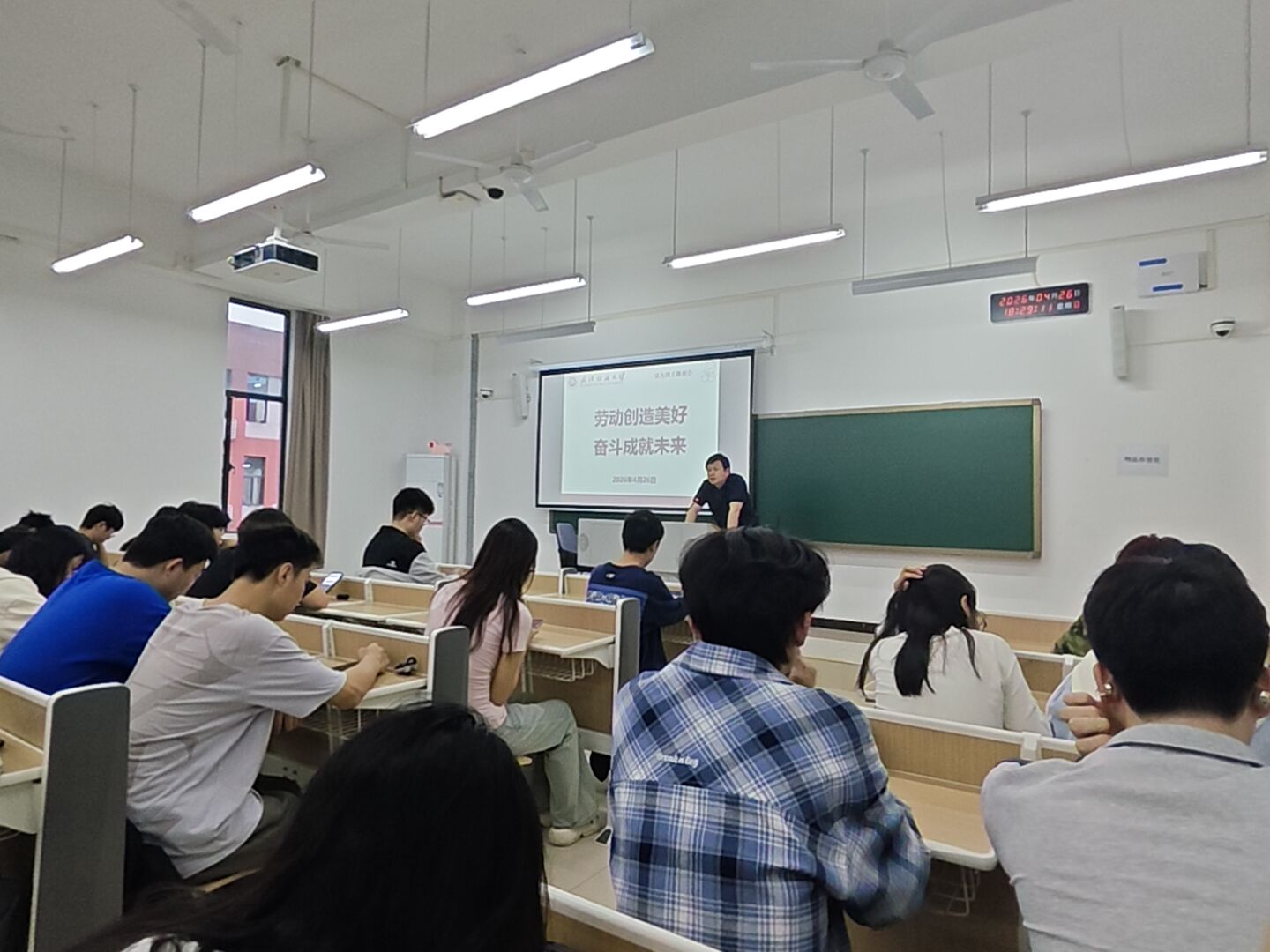班会特别设置了“致敬劳动者”环节,向扎根土地的农民、筑造城市的建筑工人、守护平安的人民警察、托举梦想的人民教师、护佑生命的白衣战士,以及无数在平凡岗位上默默坚守的劳动者,致以崇高敬意。