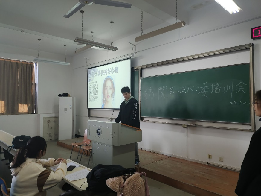 团委织心湾在三栋教学楼510教室开展了本学期第二次心理委员培训。本次会议由干事孙启泰主讲,干事朱美霞主持,全体心理委员参与。